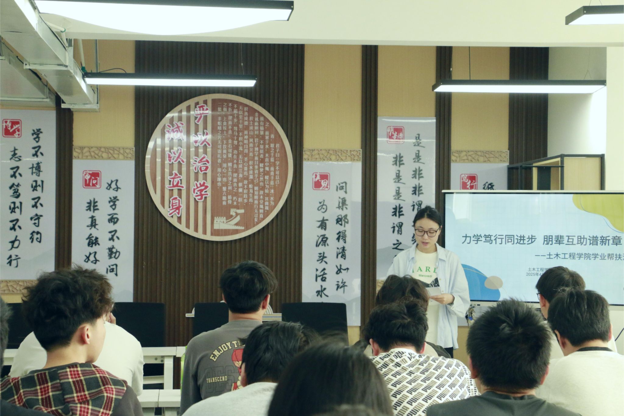 活动伊始,尹老师表示此次活动是学院推动学风建设的重要举措,旨在构建"互帮互助,携手共进"的学习共同体。她对学生提出三点期望:一是希望受助学生主动求教,把握提升机会;二是期待帮扶志愿者倾囊相授,传承土木人"砼心协力"的精神;三是帮扶双方在互促共进中实现"1+1>2"的帮扶成效,让知识传递与精神传承同频共振。