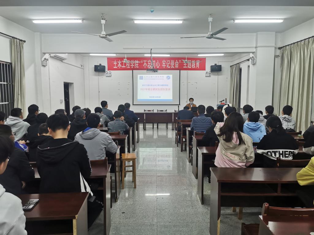 2020年10月5日晚上19:30,武汉工程大学土木工程与建筑学院领导一行到我院开展2021年硕士研究生招生工作宣讲会,我院组织2021届本科毕业生中有意愿报考硕士研究生的同学前往宣讲会现场咨询。此次宣讲活动在天工楼504多媒体教室举行。