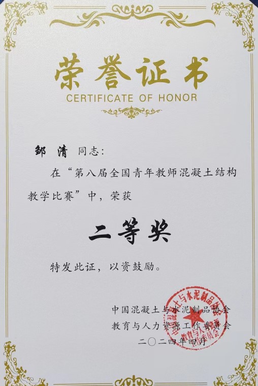 在同期举办的第八届全国青年教师混凝土结构教学比赛中,共有来自哈尔滨工业大学、武汉大学、华南理工大学等全国58所知名高校80余名青年教师代表参赛,参赛教师在比赛中展示了各自在混凝土结构教学方面扎实的专业知识和创新教学方法。经过激烈角逐,我院青年教师邹清荣获二等奖。此次参赛获奖,反映了我院青年教师的基础理论知识和专业教学水平,提升了我院土木工程专业的知名度和美誉度。