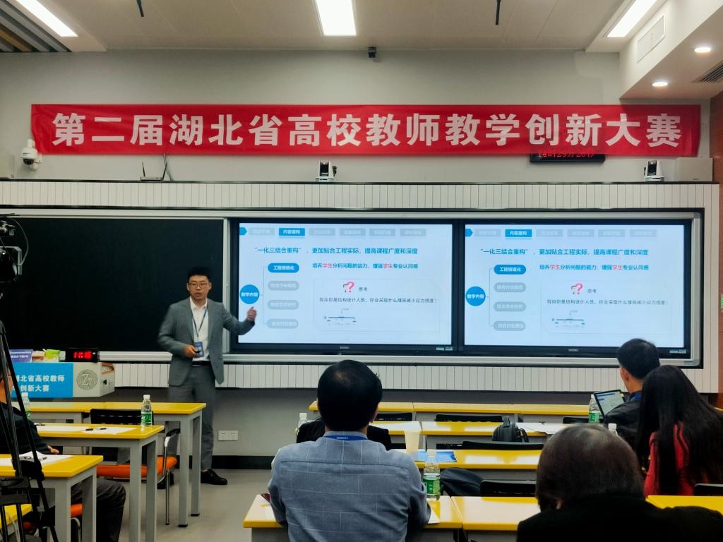 教学创新大赛以“推动教学创新 培养一流人才“为主题,分为网络评审、现场评审两个阶段。此前,李青老师团队在网络评审阶段凭借厚实的课程基础、高质量的课堂教学实录和教学创新报告,成功入围现场评审。决赛现场,李青老师作为团队负责人以《基于“1+N“模式的结构力学课程教学创新实践》为题,从课程介绍、教学痛点、提出理念和思路、创新举措、教学成效等五个方面,进行15分钟的教学创新设计汇报,充分展现了他热爱教学、倾心教学、研究教学、潜心教书育人的精神风貌。提问环节中,他真诚谦逊的态度、敏捷清晰的思维和精准简洁的回答,进一步深化和拓展了他的创新设计。最终,李青老师以扎实的教学功底、先进的教学理念、独特有效的教学创新举措和精彩的现场表现,赢得了现场评委专家的充分认可,取得了中级组二等奖的优异成绩。