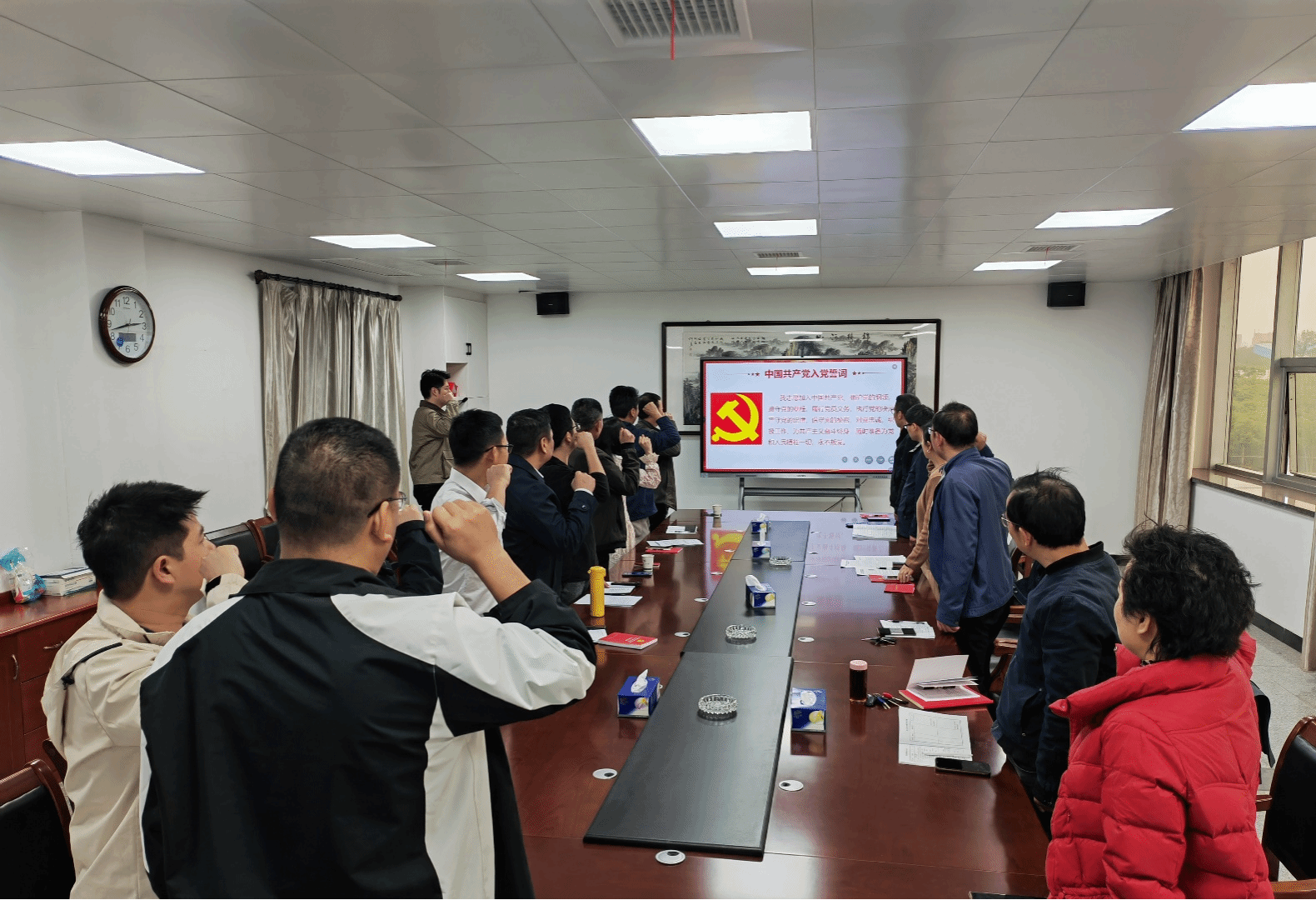 主题党日活动伊始,由3月份政治生日党员领誓、全体党员起立,一起重温入党誓词,铿锵有力的誓词声中,党员们再次坚定了初心使命,强化了党性修养,接着,支部组织学习了《中国共产党章程》相关内容,进一步加深了党员对党章党规的理解。