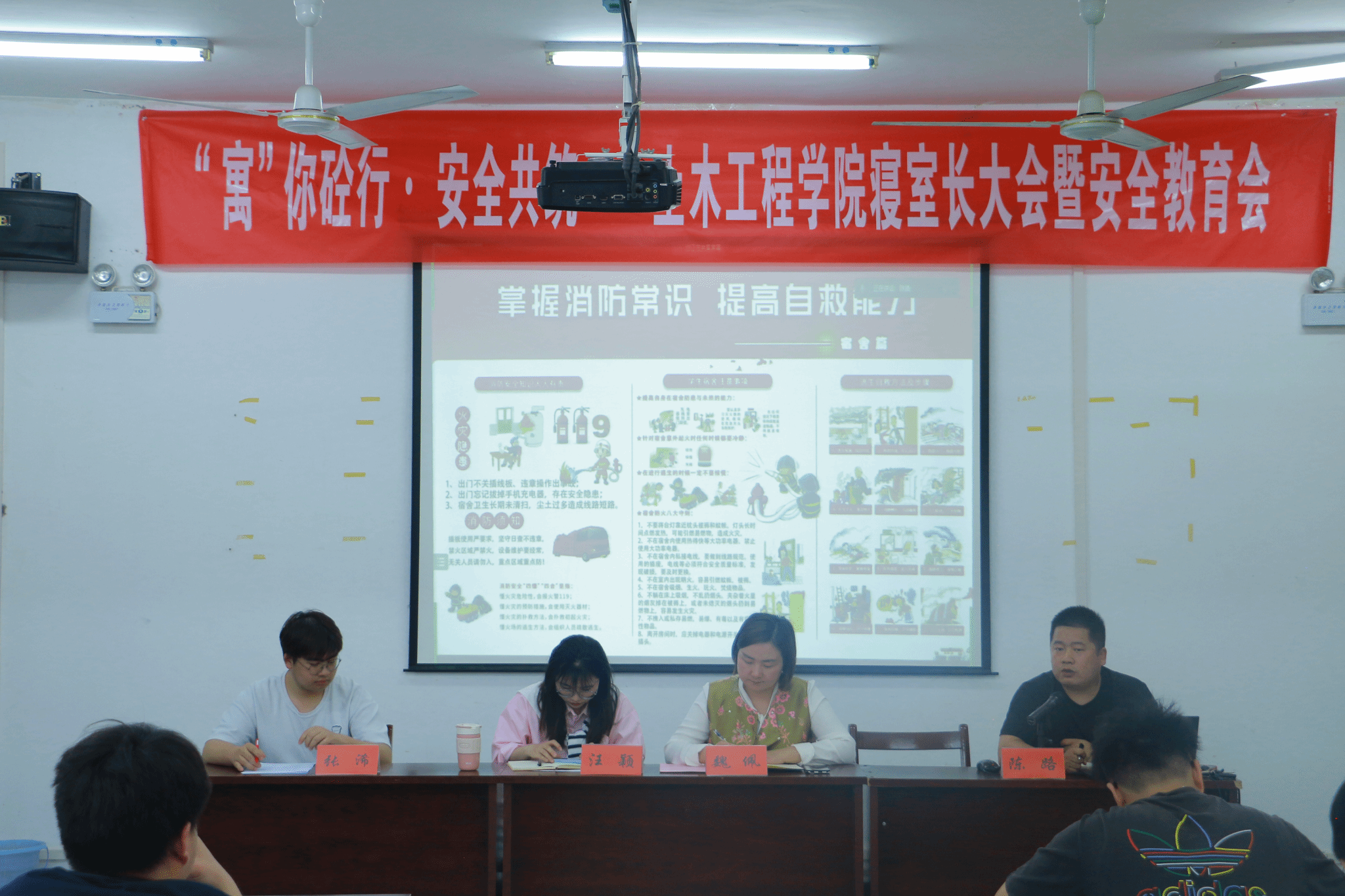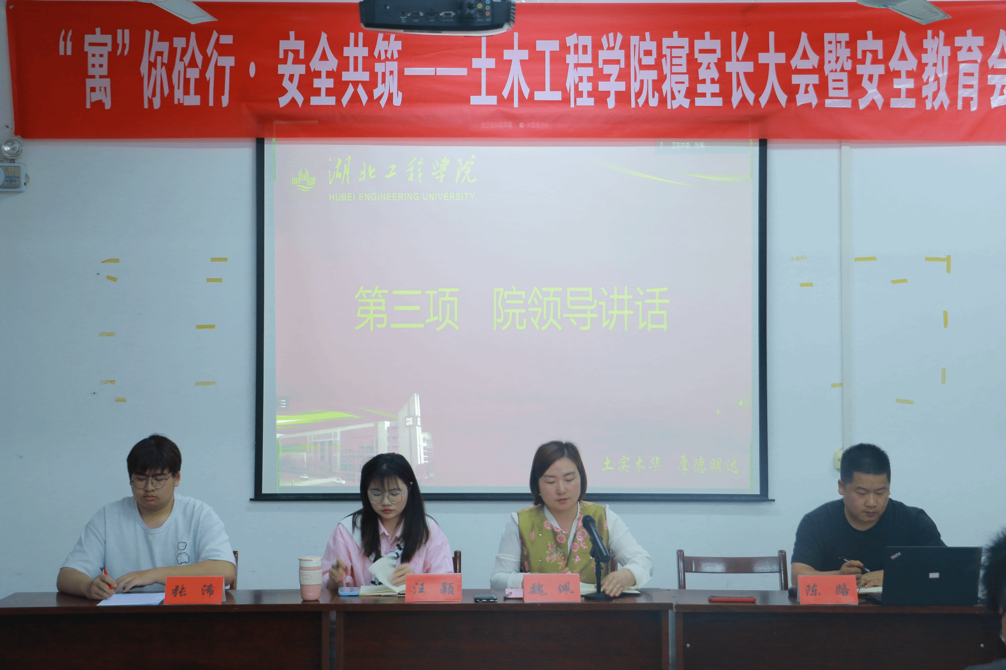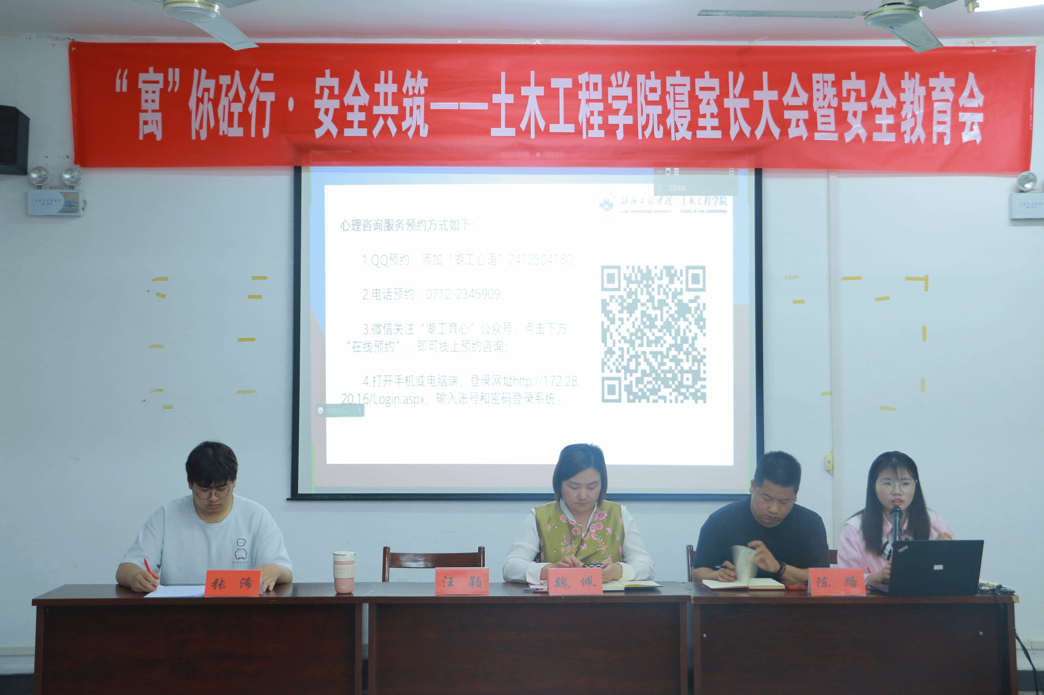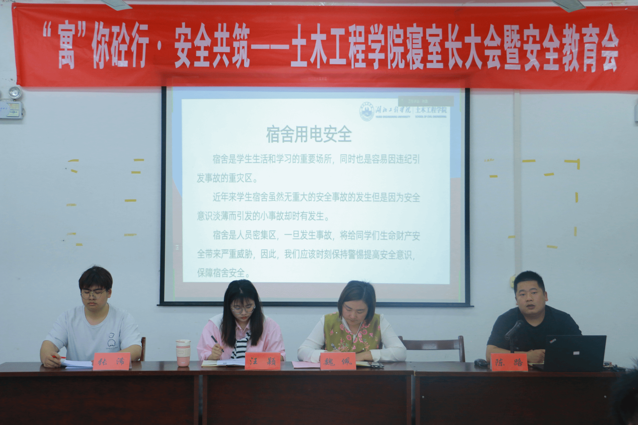 为进一步增强学生的安全意识,强化学院寝室管理工作,形成文明和谐的寝室环境,我院于4月18日在天工楼504召开“寓”你砼行 安全共筑——寝室长大会暨安全教育会,会议线上线下同步进行。学院党委副书记魏佩,辅导员汪颖、陈路,学院寝管会干部和全院寝室长参加,会议由辅导员陈老师主持。