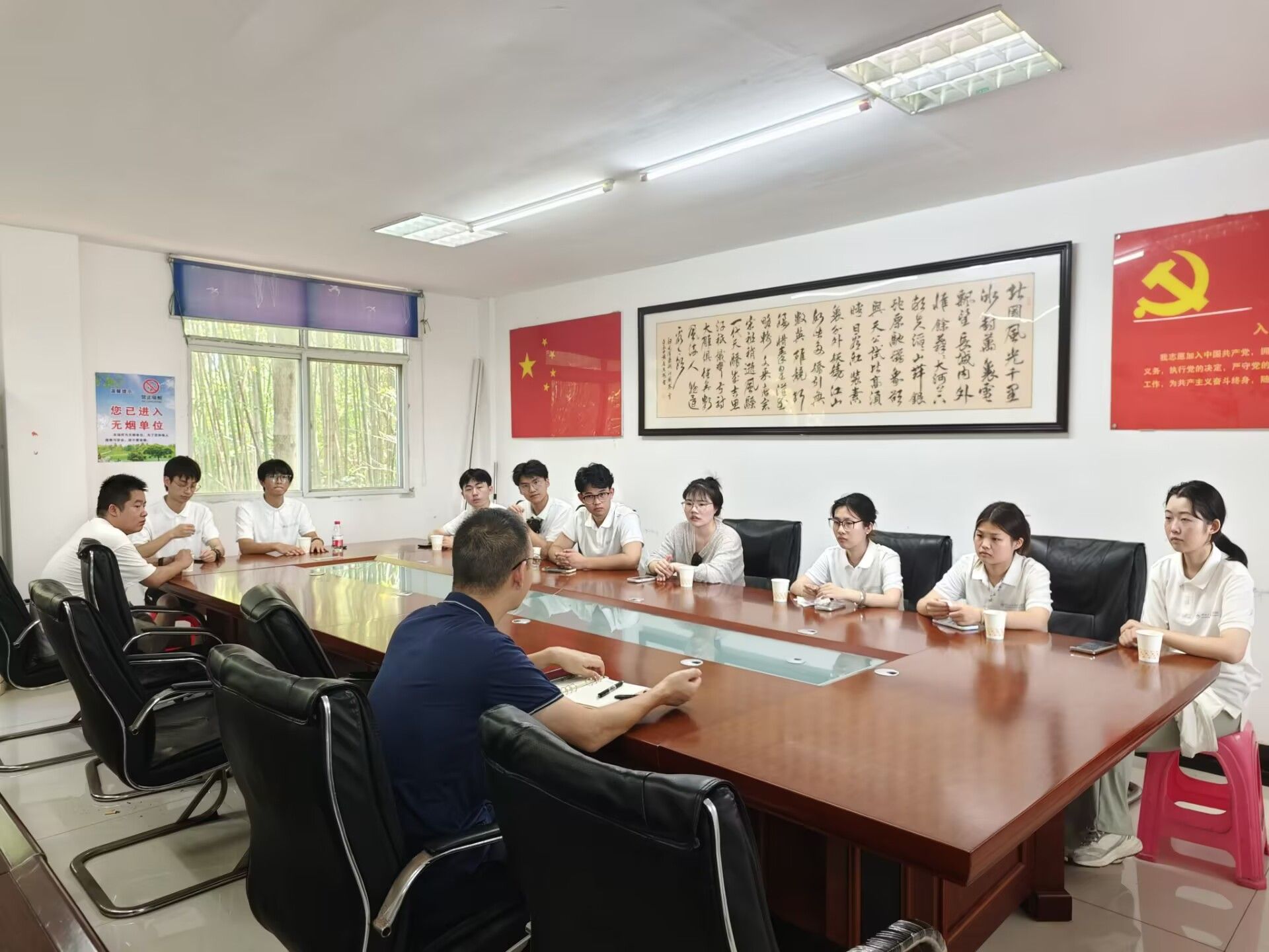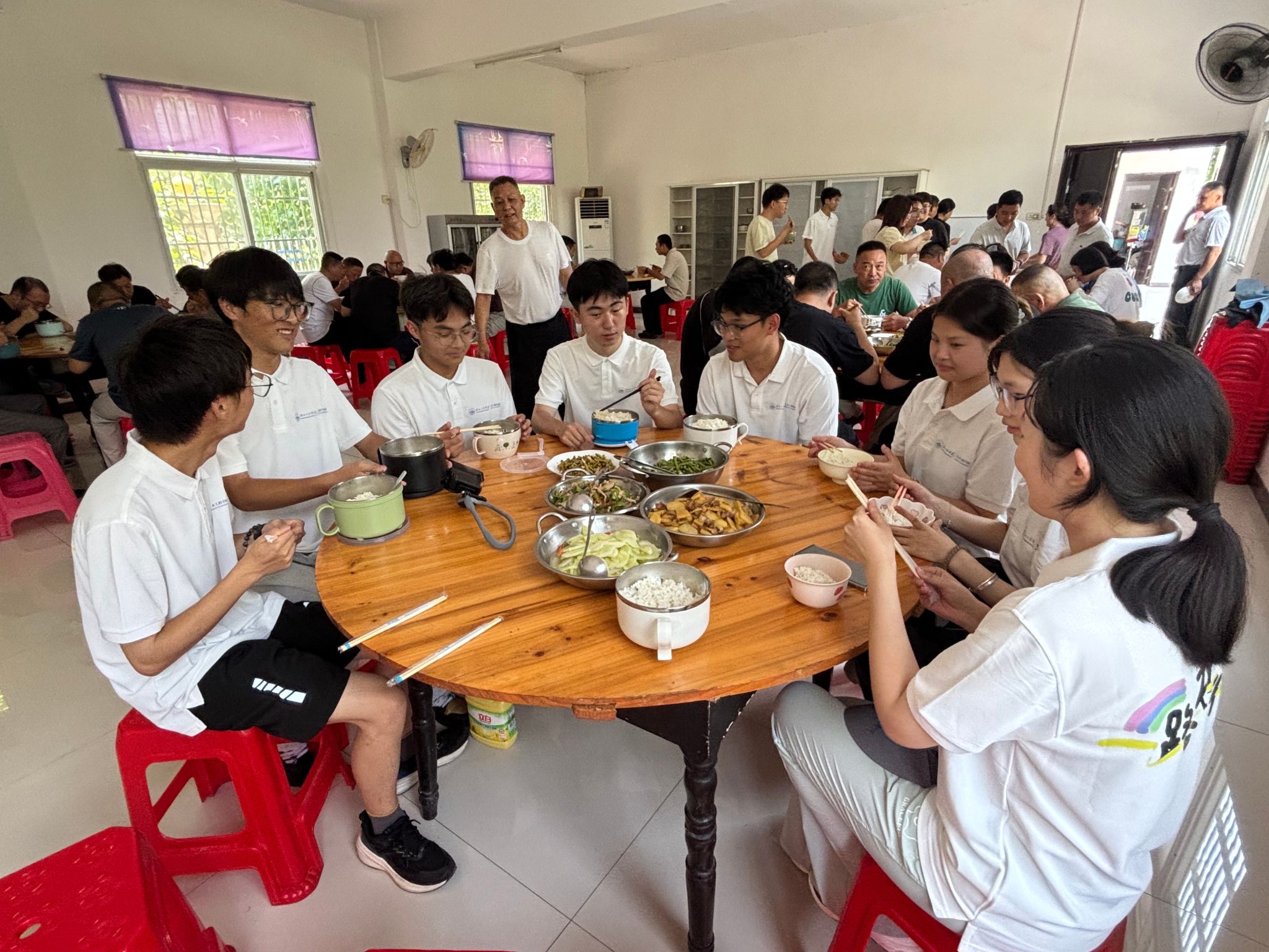 经过一个半小时车程,全体实践队顺利到达安陆市接官乡。为了更好地了解接官乡当地情况以及开展后期相关工作,乡政府相关领导与全体实践队员召开接洽会议。会议上重点强调了安全管理和团队纪律,要求全体成员牢固树立安全意识,把暑期课堂等相关活动办好的同时也要注意自身安全。会议结束后,大家来到接官乡政府食堂用餐。荤素搭配的家常菜、温热可口的饭菜,不仅驱散了旅途的疲惫,更让成员们感受到当地的热情。