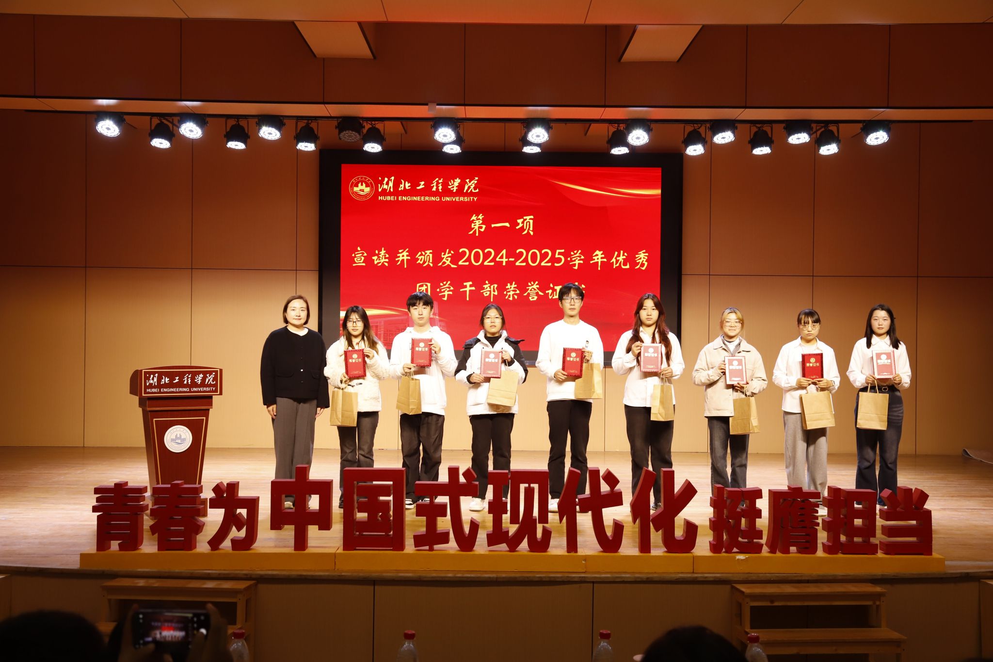 会议第一项议程,辅导员尹驰老师宣读了《关于表彰TYC234CC太阳成集团2024-2025学年优秀团学干部的决定》,对周伊纯等8名为学院团学工作表现突出的同学予以表彰。在热烈的掌声中,党委副书记魏佩老师为获奖代表颁发了荣誉证书。这份荣誉,不仅是对他们过去一年辛勤付出的肯定,更是对全体学生干部的激励与鼓舞。