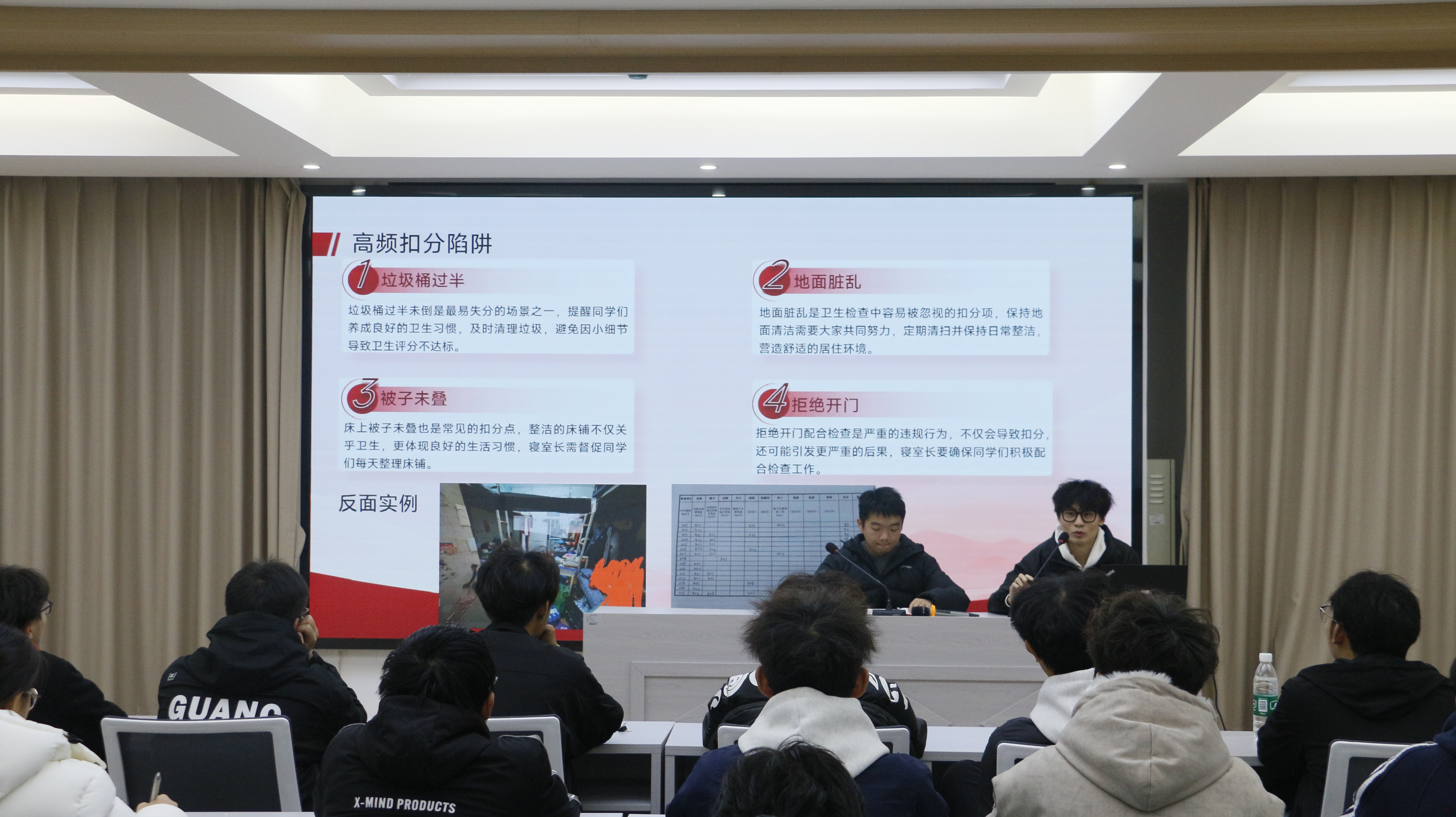 会议伊始,学院寝管会潘子康同学结合近期宿舍卫生与安全检查的实际情况,详细梳理并讲解了宿舍内务整理的“高频扣分陷阱”,提醒各位寝室长关注细节,带领室友共同维护整洁环境。同时,他详细介绍了宿舍区突发事件的处置流程,强调“第一时间报告辅导员”的基本原则,确保应急响应迅速有效。此外,他还就日常设施报修渠道与注意事项进行说明,为寝室长提供了实用的管理方法。