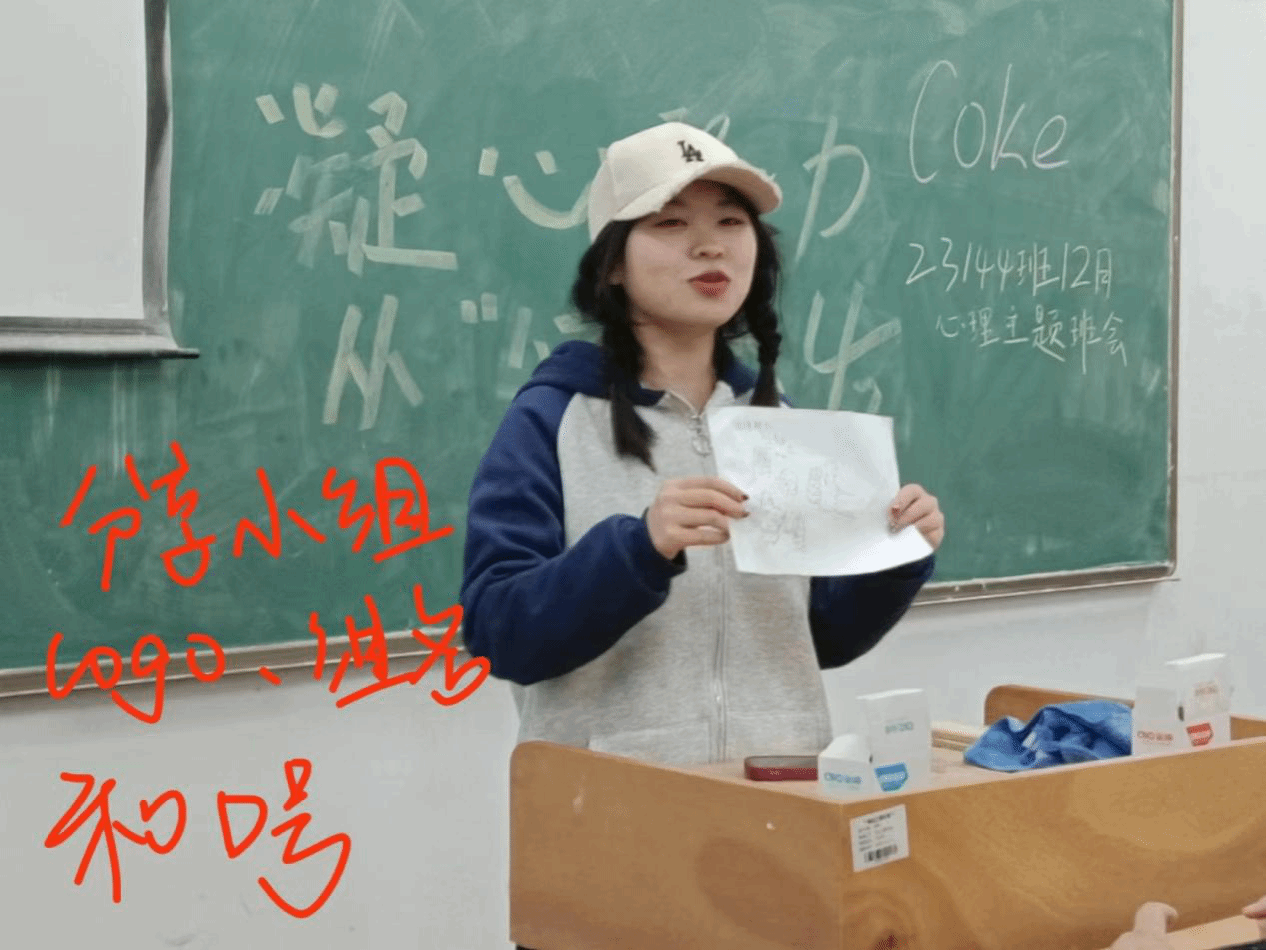 本次心理主题班会主要包括以下流程:我的团队我做主、凝心聚力、心有千千结和同心前行。首先在我的团队我做主中由各小组讨论并确定队名和口号,设计出专属于小组的logo,并由一名代表对此进行发言解释;在确定号团队队名和口号后,同学们开始进入游戏环节:“坐地起身”,在这个游戏过程中需要大家在不借助外力且不能用手支撑的情况下一起站起来,十分考验小组成员的默契和配合力。而“解手链”则是同学们站立围成一个圈,成员脸朝内侧,然后双手交叉双手握住左右队员的手,需要大家用钻、绕的方式解开手结。两个游戏结束之后大家一同讨论确定班级的班歌,在合唱结束之后写下自己对班级的祝福。