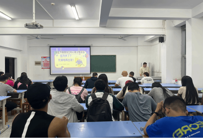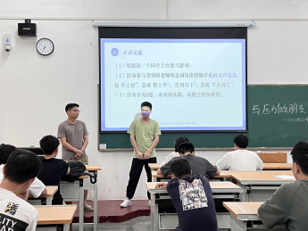 活动中同学们通过“正话反说”小游戏导入心理班会主题,随后做了一个压力小调查来了解大学生存在的普遍压力源,最后班级同学一起观看缓解压力以及如何与压力共处小视频并做出总结。