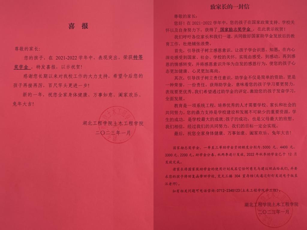 同时,为勉励表彰优秀学生,让家长共同分享学生成长成才喜悦,学院特意为特等奖学金和国家励志奖学金获得者家庭寄送喜报,一张张鲜红的喜报,承载着学院深深祝福和殷切期望寄往全国各地,为学生家庭带来了惊喜和欣慰。给家长的一封信中对于学校的资助政策进行了详细的宣传,这样的一种方式架起了学校与家庭的沟通桥梁,加强了家校合作,拉近了家校之间的距离,各项资助育人工作的开展也凸显了学院的人文关怀。