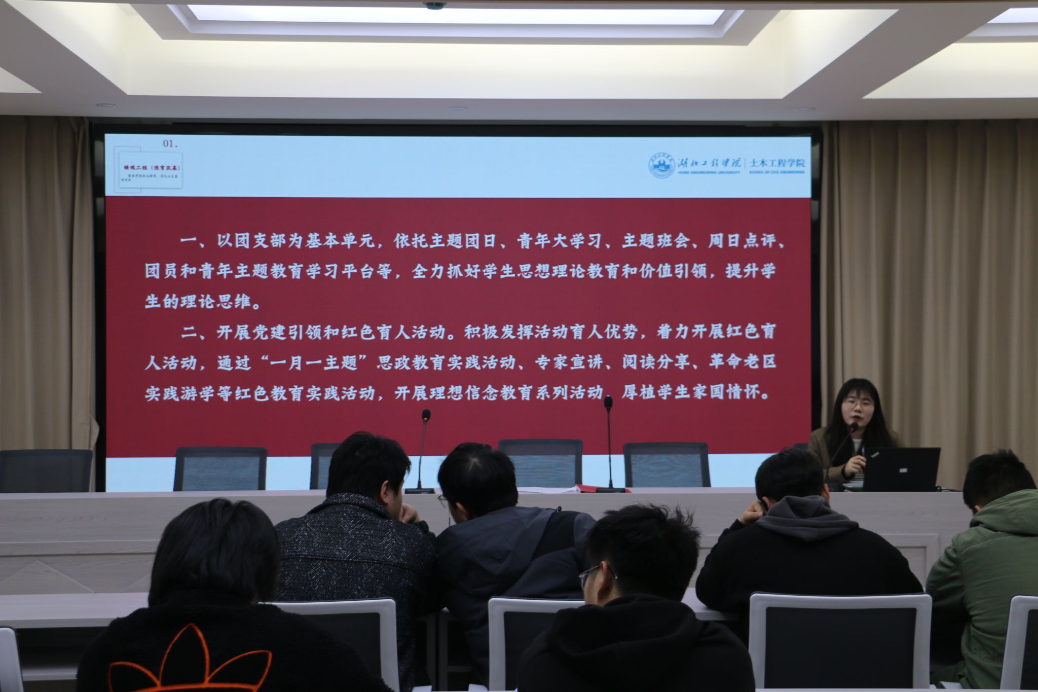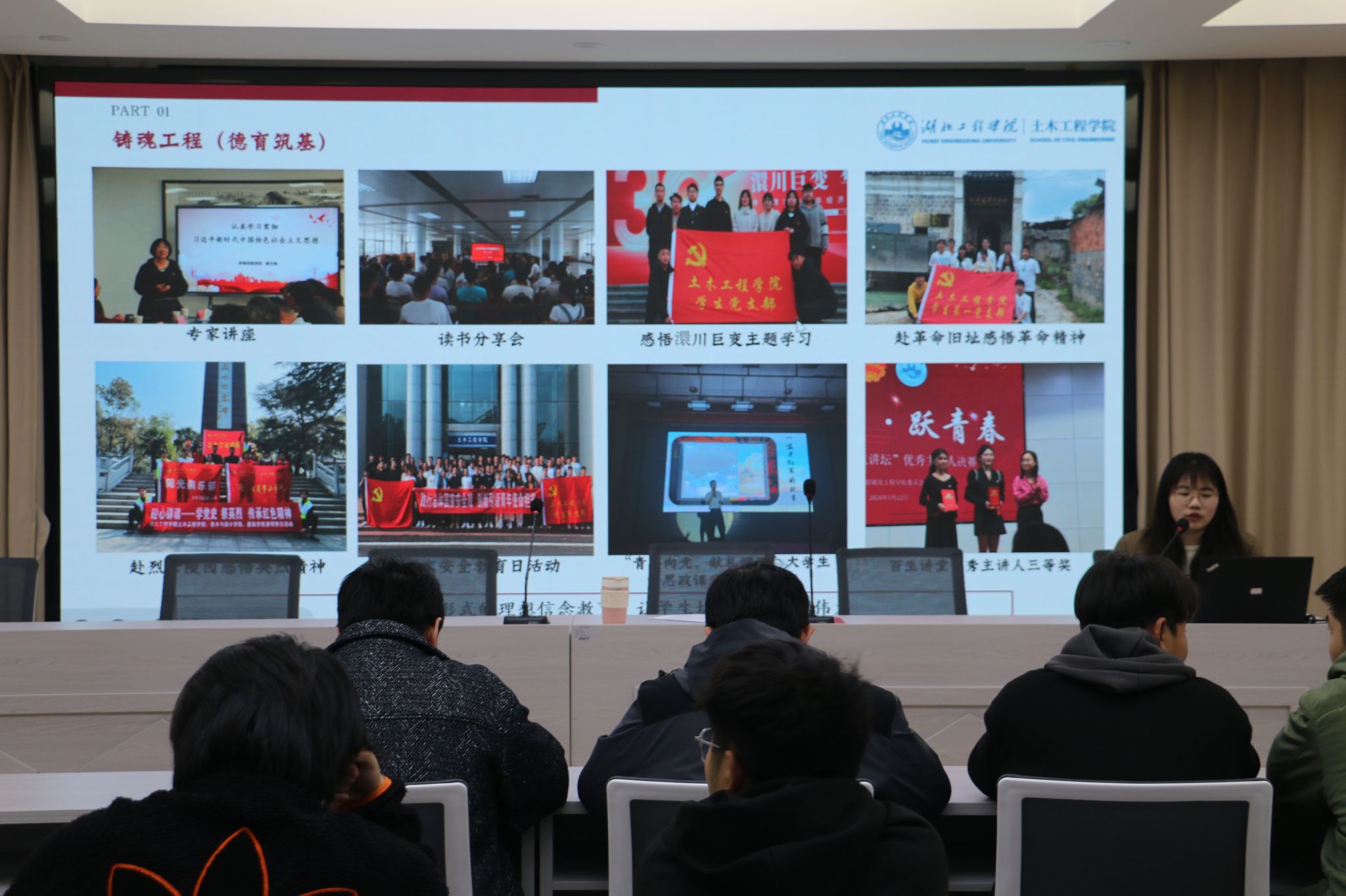 随后,汪老师从审核评估指标体系出发,将学院“五筑工程”逐步铺陈开来。筑魂工程聚焦思想政治教育,筑牢精神之基;筑能工程致力于提升专业能力,赋予手中之能;筑美工程注重美育熏陶,让眼中有美;筑行工程强调实践锻炼,促使脚下有行;筑梦工程激发梦想力量,实现胸中有梦。