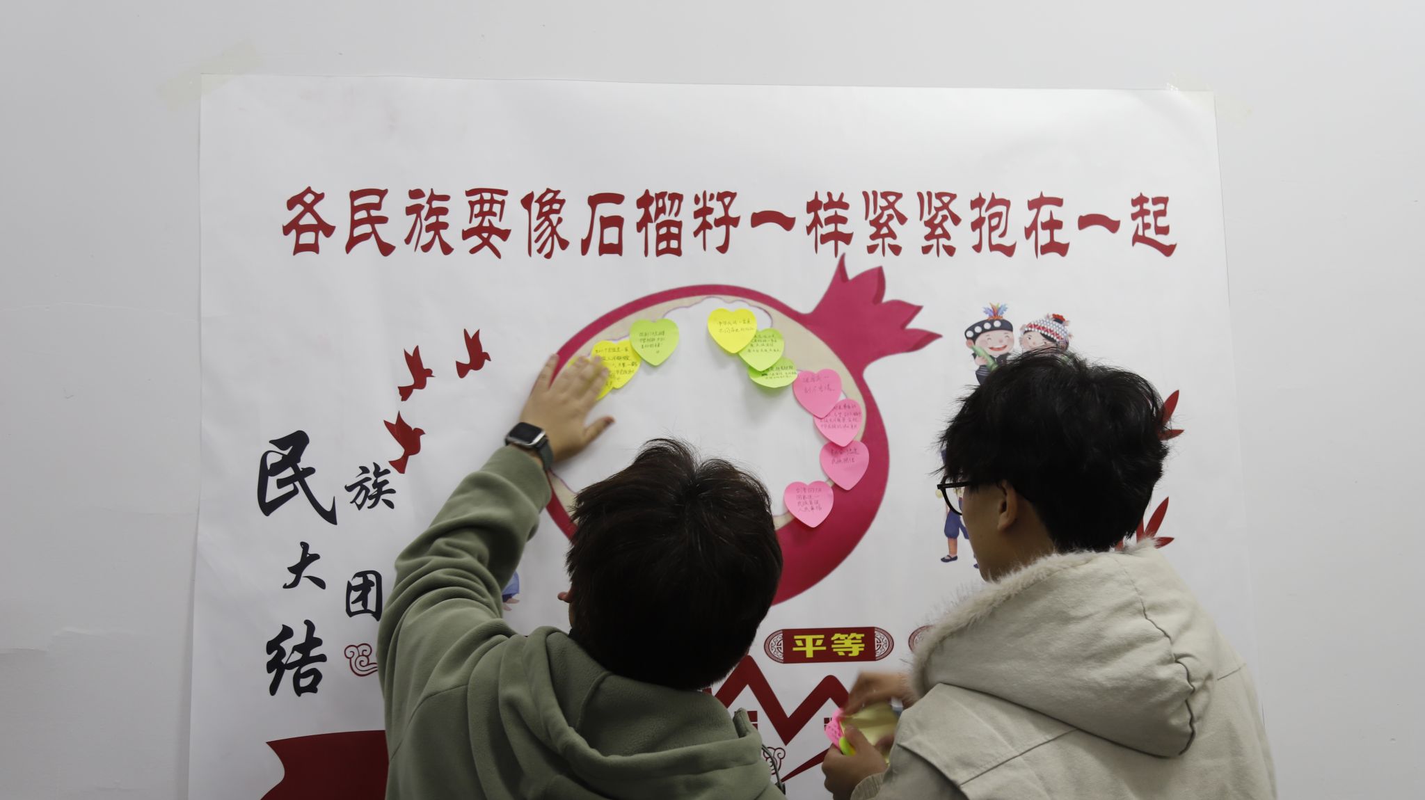 活动第二篇章,领学同学带领大家深入学习了中华民族共同体形成发展的历史规律与现实意义,阐释了“各民族血脉相融、信念相同”是构筑中华民族共同体的坚实纽带。随后,每位团员在卡片上郑重写下对民族团结的祝福与承诺,并共同拼贴成象征各民族紧密团结的“石榴籽”同心圆图案,生动体现了“像石榴籽一样紧紧抱在一起”的深刻寓意。