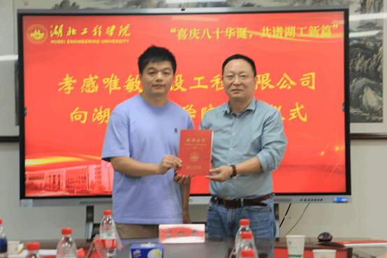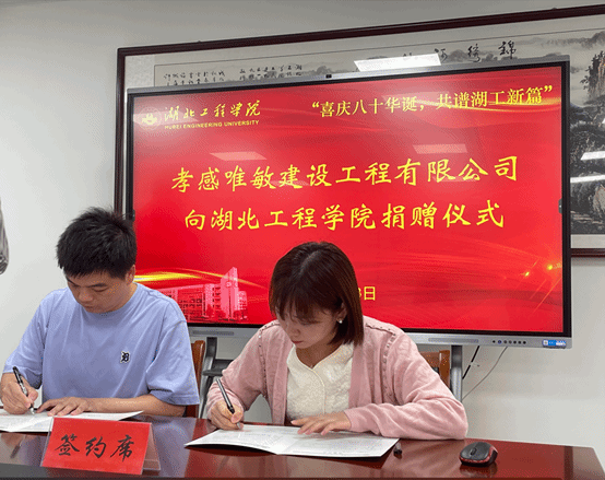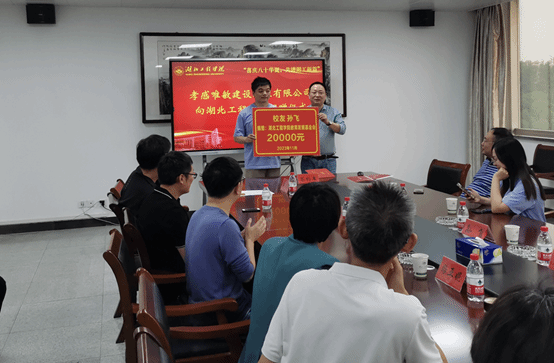 捐赠仪式上,校庆办刘艳芬代表学校与孙飞总经理签订捐赠协议。孝感唯敏建设工程有限公司向太阳成城集团tyc234cc教育发展基金会捐赠人民币2万元,用于支持学院各项事业建设发展。随后校友工作办公室主任王新国代表学校向爱心企业家孙飞颁发捐赠证书。