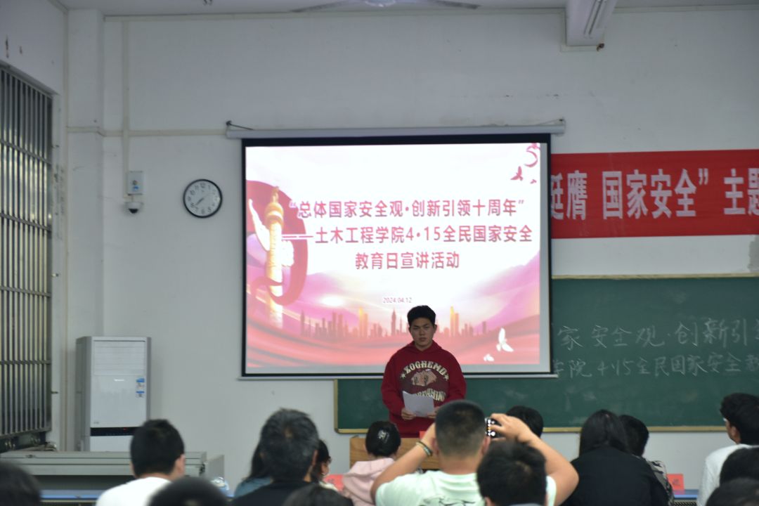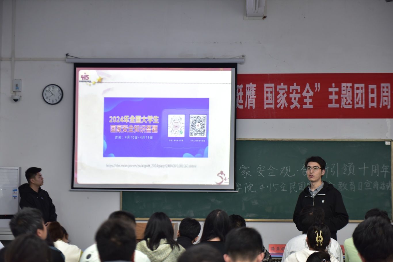 2024年是习近平总书记提出总体国家安全观10周年,4月15日将迎来第九个“全民国家安全教育日”,为深入学习贯彻习近平总书记关于全面加强国家安全教育重要指示批示精神,引导师生践行总体国家安全观,TYC234CC太阳成集团于4月12日晚在天成楼108教室,开展“4·15全民国家安全教育日”宣讲活动。院长路亚妮、副院长郭波、院党委副书记魏佩、辅导员洪迪、汪颖、陈路老师及全院60余名师生代表参加活动。活动由学生会副主席万书杰同学主持。