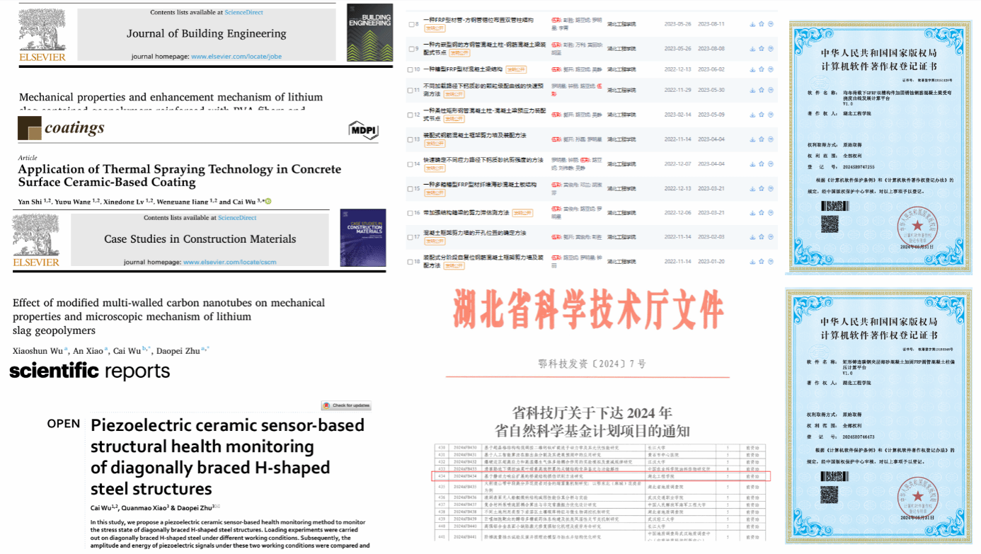 一年多来,伍彩博士以一作/通讯共发表SCI论文10余篇,主持科研项目9项,包括湖北省自然科技学基金项目、湖北省教育厅项目等;以第一申请人申请发明专利10余项、第一完成人授权软件著作权20余项。研究内容主要围绕水泥基材料、水工混凝土性能、结构健康监测及修复等方面,研究结果为矿渣在水泥基材料中的固废利用、水工混凝土的冻融破坏特性、混凝土结构的健康监测及修复等领域提供了理论依据。