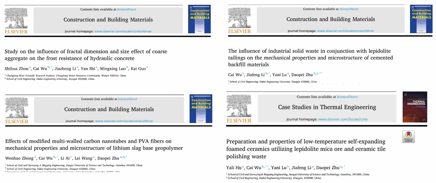 今年,我院伍彩博士作为通讯/一作在国际知名TOP学术期刊《Construction and Building Materials》《Journal of Thermal Engineering》《Journal of Building Engineering》发表SCI论文4篇,合作单位有伍彩博士的博士后出站单位长江水利委员会长江科学院及江西理工大学。