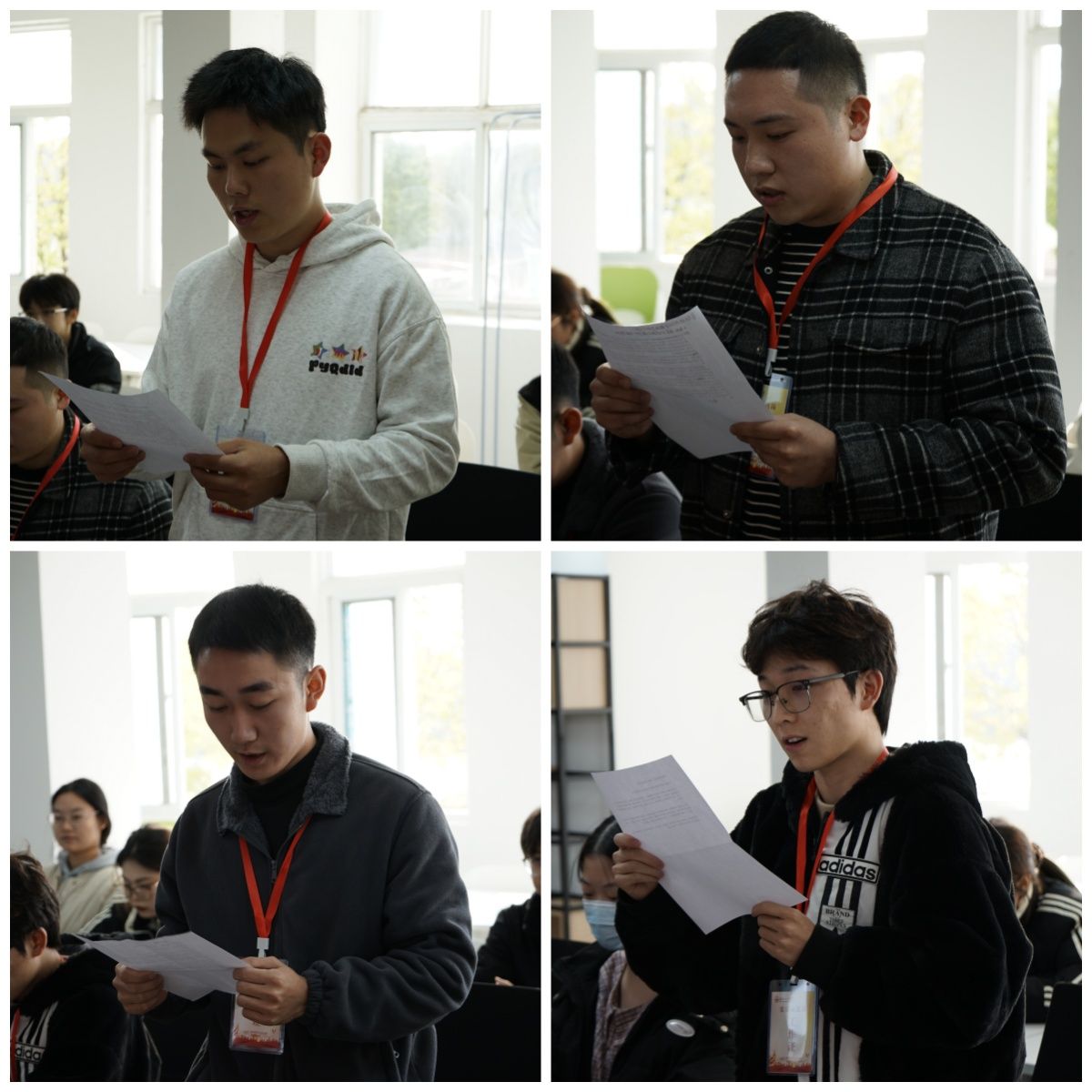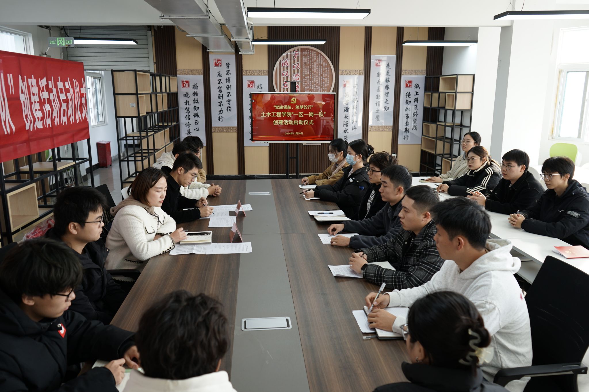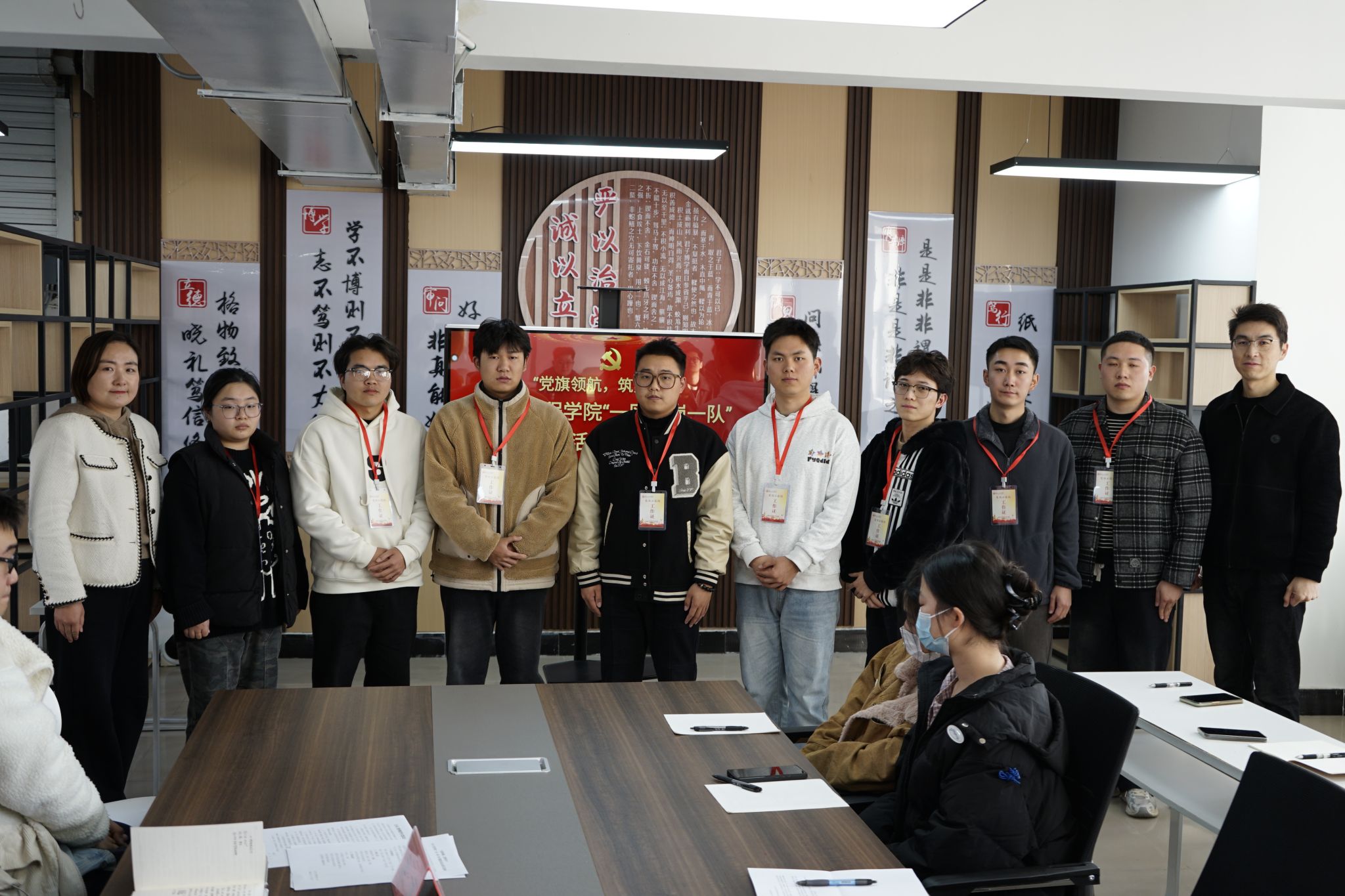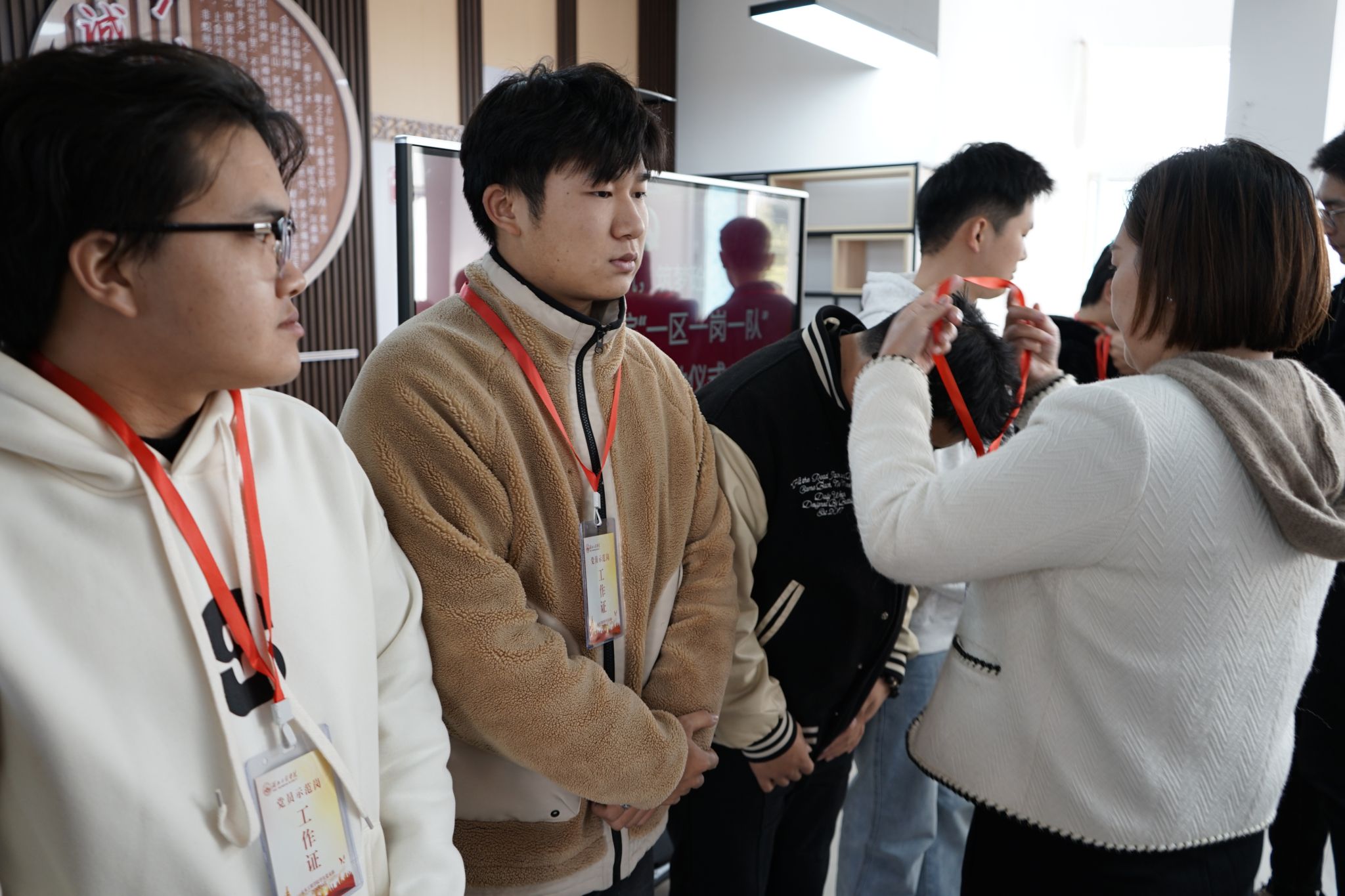 随后,老师为率先加入党员示范岗的党员代表挂牌,正式宣告入职。党员示范岗成员逐一表态,大家表示,将时刻以一名合格党员的标准严格要求自己,始终以饱满的热情和坚定的信念,全程全情全力投入到“一区一岗一队”创建活动中,为同学们提供更加贴心、实际、及时、有效的服务和帮助,为学院发展和同学成长贡献力量。