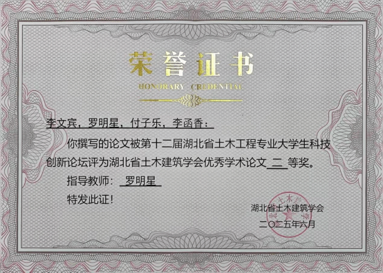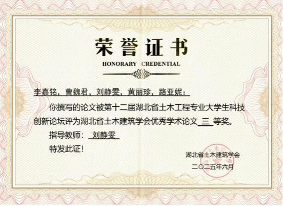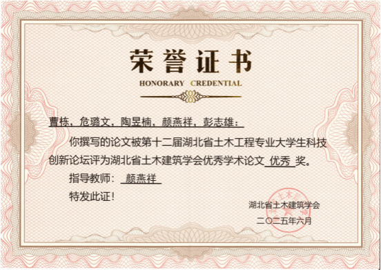 本次获奖不仅是我院对科研育人的高度重视的体现,也进一步激发了学生参与科研实验的积极性以及发挥科技创新的创造性,同样体现我院对土木工程专业其“智造未来·绿色赋能”的未来发展前景的重点关注。未来,学院将继续以学科交叉融合和科研能力提升为重点,鼓励更多青年学子参与科研活动,在土木工程领域上培养更多高素质人才。