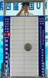 本届大赛由中国混凝土与水泥制品协会主办,超高性能水泥基材料与工程技术分会协办。大赛的主题是制备拥有高弹性的UHPC球。设计制作出质量和性能好的UHPC弹性球并不容易,UHPC球不仅要满足重量、直径及尺寸精度要求(限制条件为直径200±10mm,重量 ≤ 6000g),拥有良好的外观,还要测试自由落体2m冲撞钢板(40mm厚钢板埋设锚固在重约1.2吨的UHPC墩台上表面)反弹高度和损伤情况,需要球体同时具备高刚性和高韧性。