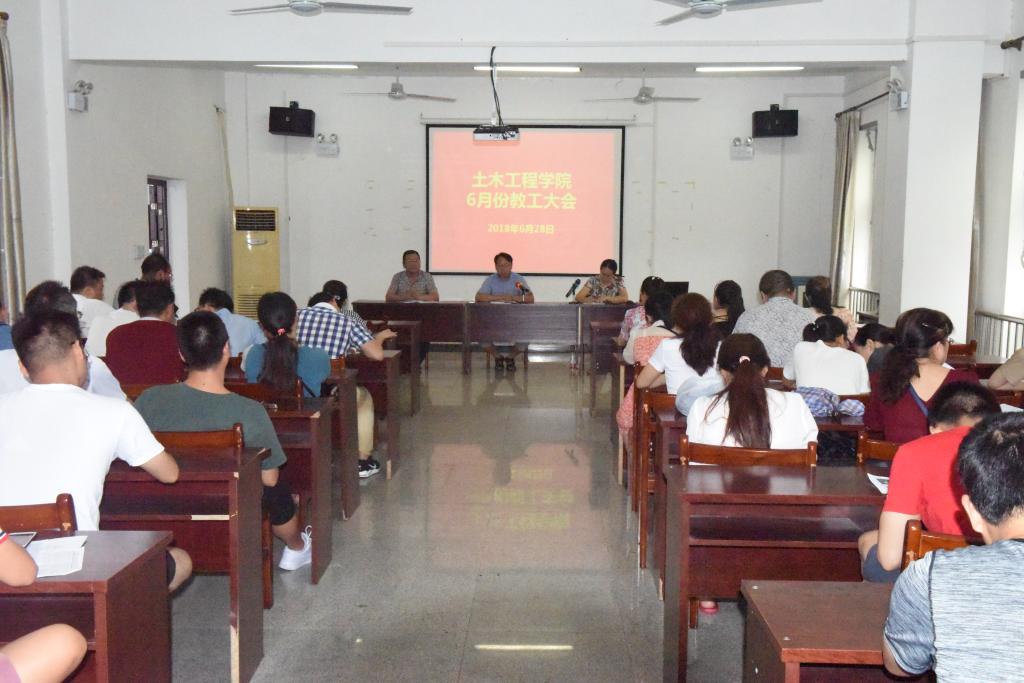 2018年6月28日下午,TYC234CC太阳成集团6月份教职工大会在天工楼504召开。会议由党总支副书记徐明霞主持。 首先,常务副院长李晓目对本学期期末教学工作及暑期前后相关工作做了安排部署;随后副院长杨元明传达了学校近期科研与学科工作相关文件及会议精神,对暑期社会服务相关工作进行了安排部署,并强调了关于国家项目的申报准备工作。最后党总支副书记徐明霞带领全院教职工开展政治理论学习,主要内容有习近平总书记视察湖北重要讲话精神;习近平总书记在中国科学院第十九次院士大会、中国工程院第十四次院士大会上的讲话精神;学习许志华先进事迹等。