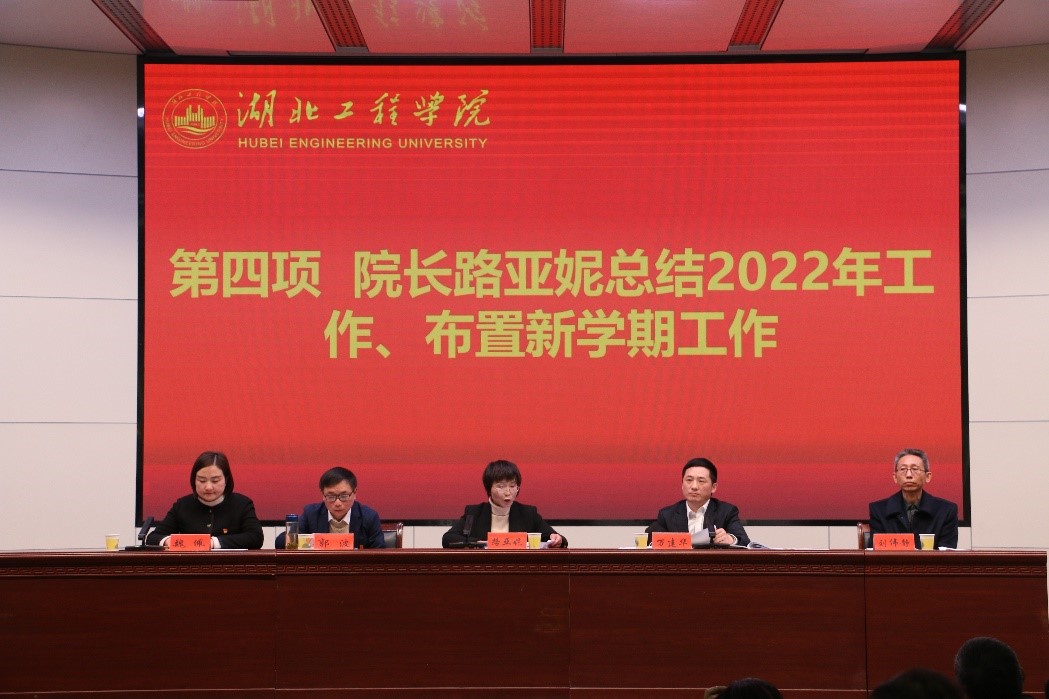 随后院长路亚妮从党建思想政治工作、教学工作、学科建设与科研工作以及学团工作等方面对学院2022年工作进行了全面总结,肯定了学院取得的成绩,并提出在省级教研项目及成果、传统专业升级改造以及省级科研平台建设等方面存在进一步提升的空间,并对近期及2023年重点工作进行了整体部署,最后号召全体教职工主动思考、积极作为、团结一心,推动学院发展迈上新台阶。