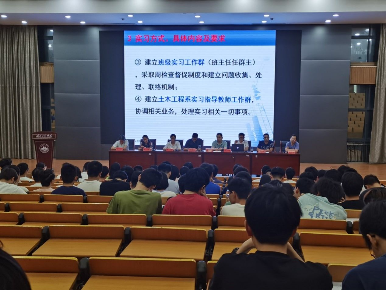 2023年6月19日晚在天成楼315报告厅,土木工程系召开土木工程专业生产实习动员大会。工程实践和社会服务专家、优秀教师代表黄俊舟老师,建筑学系主任吴明杰,土木系支部书记吴静,土木系主任颜燕祥,土木系大三年级班主任鲁威老师、李倩老师、程万钊老师、邹清老师及各实习班学生221人参加此次大会,会议由土木系支部书记吴静主持。