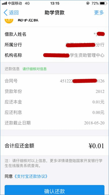 4. 输入助学贷款支付宝账户(可在生源地信用贷款系统中查询或合同上查询)、身份证号码,点击【查询还款信息】
