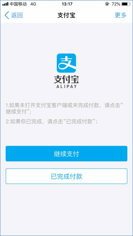 7. 如果未打开支付宝客户端或未完成付款,点击【继续付款】