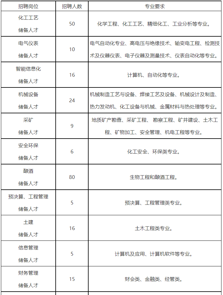 2022年计划招聘大学生266人,其中化工类50人、电仪类26人、机械类24人、采矿类9人、酿酒80人、工程管理21人、管理类56人,具体如下: