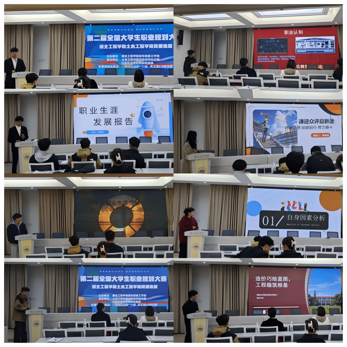 本次大赛吸引了众多土木学子的积极参与,最终8名同学进入到学院决赛。选手们围绕职业目标、学习实践行动、动态调整、职业所需的关键能力与素养、实施路径、岗位需求、个人选择与兴趣以及个人经历与实践等相关内容进行陈述与展示。大家在比赛中充分展现出扎实的专业知识和对行业趋势的敏锐洞察,无论是投身建筑设计前沿,追求结构力学的精妙创新;还是扎根工程建设一线,致力于基础设施的稳固搭建,都彰显出土木人踏实严谨、勇于担当的精神风貌。