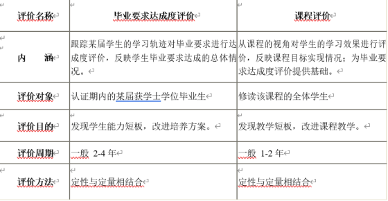答:毕业要求达成度评价与课程评价的目的、对象、方法均不同,课程评价是毕业要求达成度评价的基础,两者的具体关系见下表: