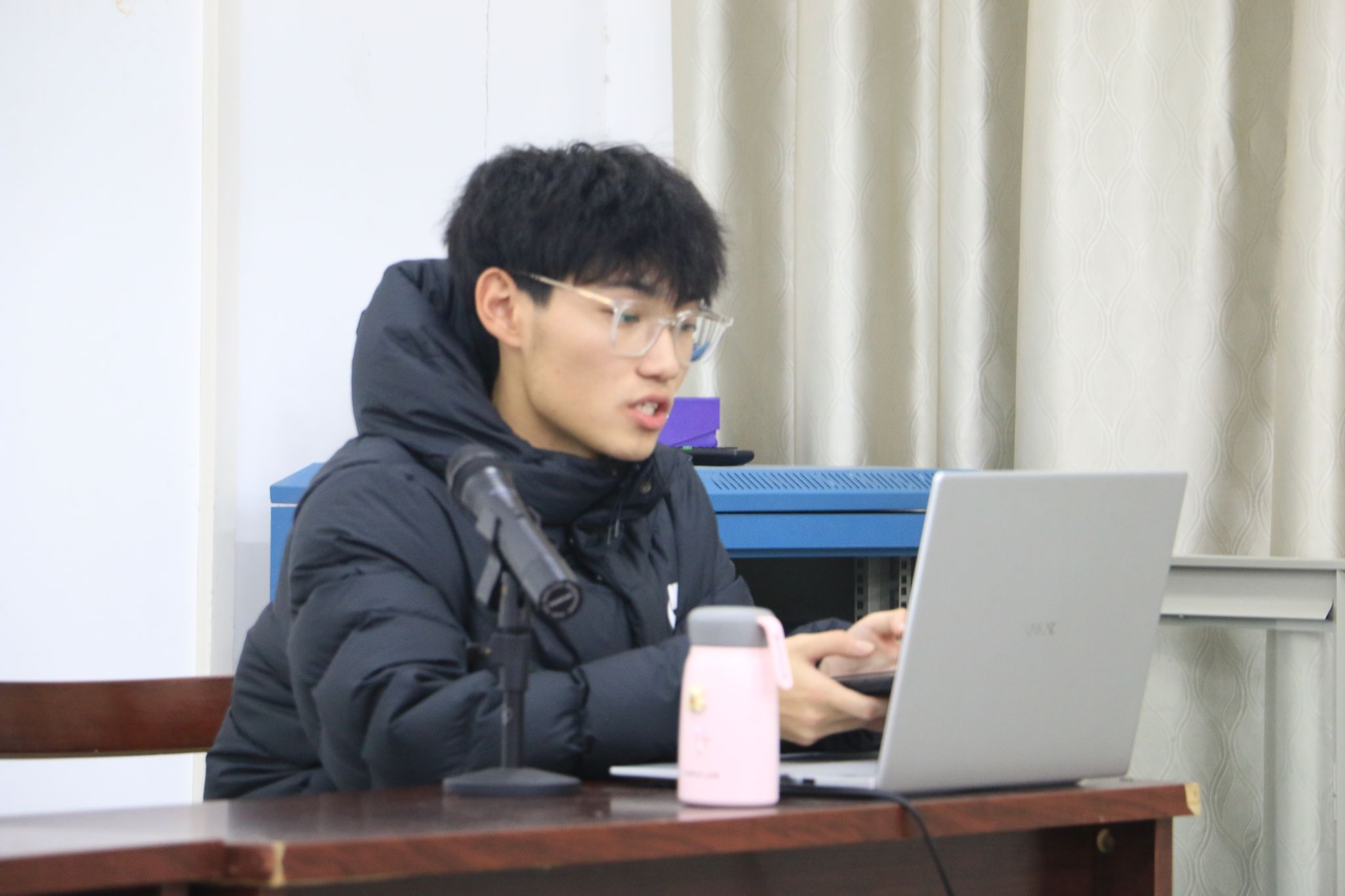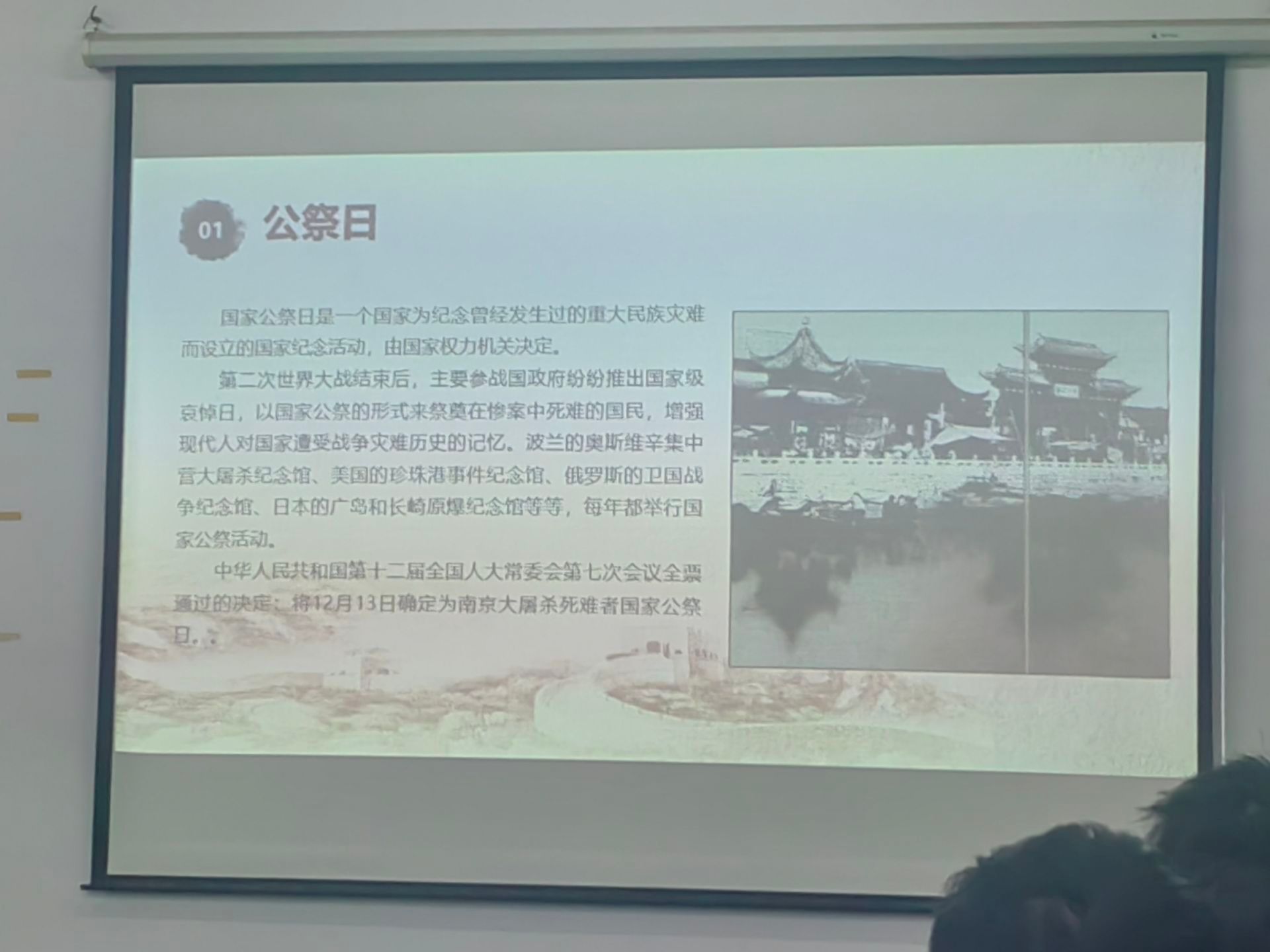 活动伊始,院青协办公室成员宋子成讲解“南京大屠杀”PPT内容,现场沉重严肃,南京大屠杀是所有国人心中不可痊愈的伤疤。