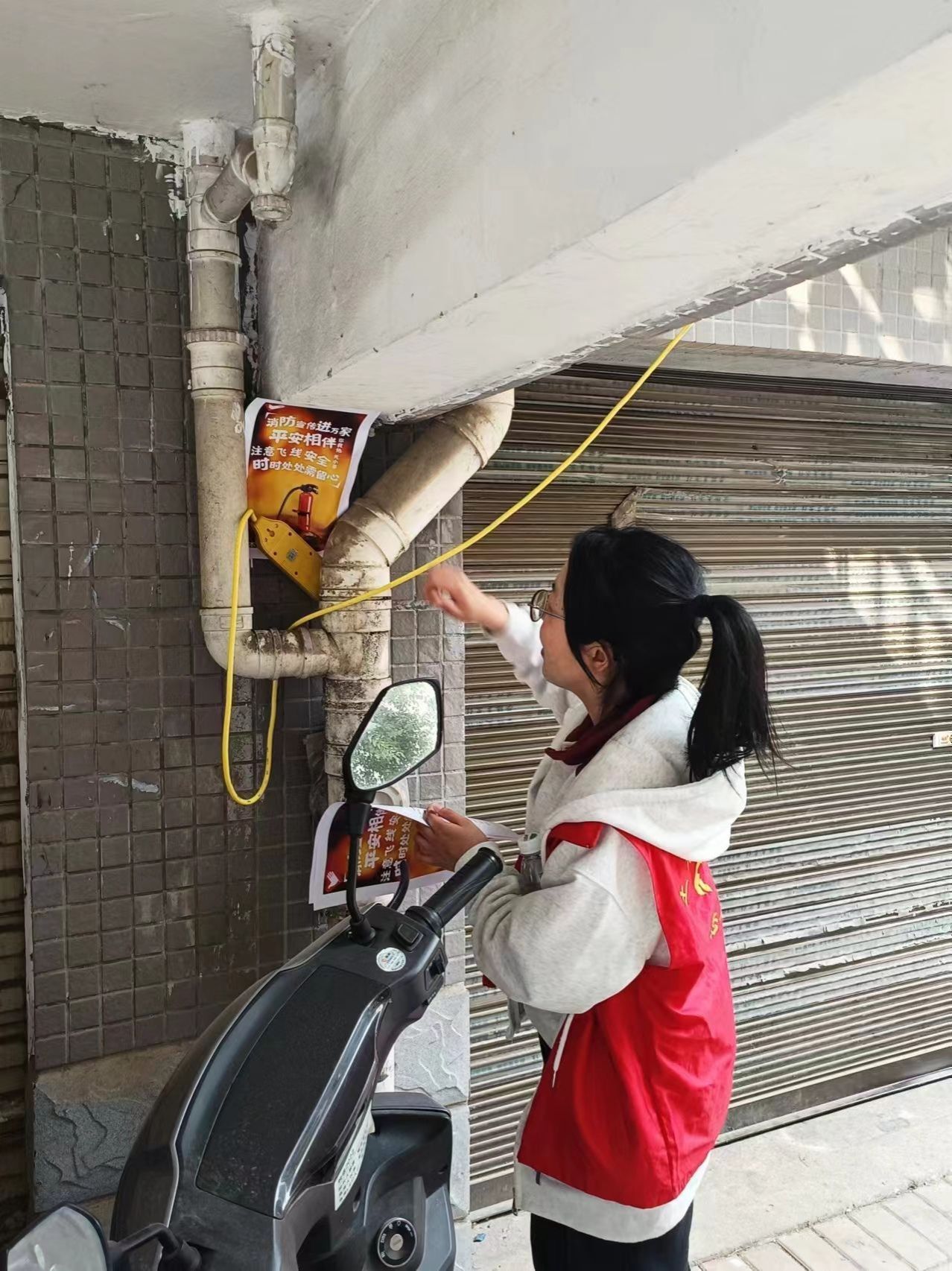 据了解,后湖社区所辖住宅小区存在大量电动车飞线充电现象,安全隐患极大,如易导致充电插板烧蚀,从而引发火灾;占用消防通道,影响消防安全……志愿者们意识到普及安全知识迫在眉睫,便在初步调研后开始有条不紊地深入周边小区进行消防安全知识宣传。